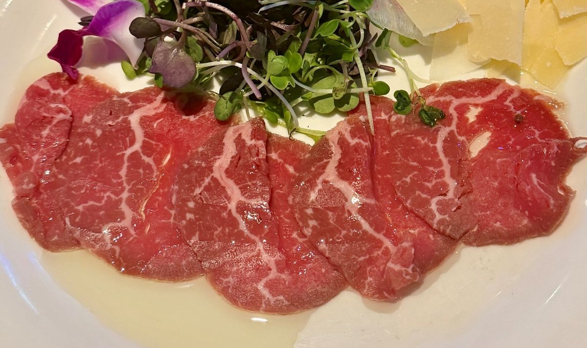 After a wonderful day at sea we sat down to the ship’s Italian restaurant for Valentine’s Day dinner. This was the first carpaccio appetizer I saw when I checked the restaurant menus after boarding, but it was the third I tasted on the trip.